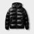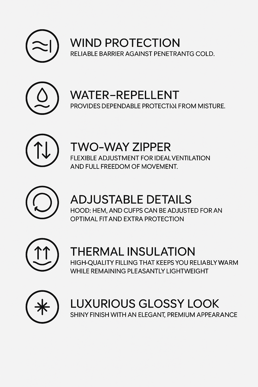 Black, adjustable hood, front pockets, plastic zipper, inside pocket, shiny finish.